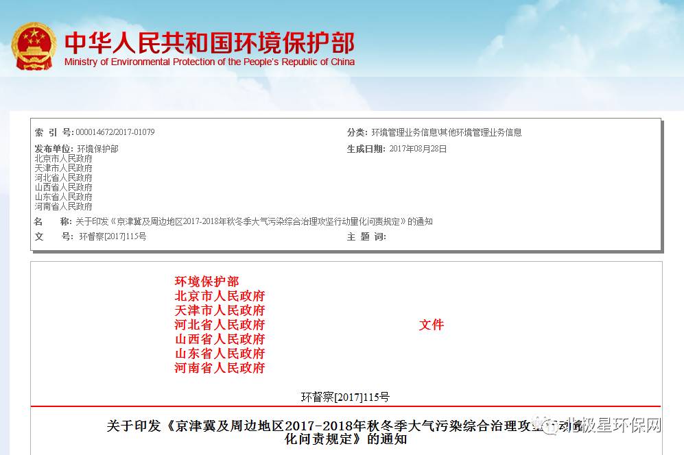 为推进京津冀及周边地区2017-2018年秋冬季大气污染综合治理工作,切实传导压力、压实责任,根据京津冀及周边地区大气污染防治协作小组第十次会议精神,以及《党政领导干部生态环境损害责任追究办法(试行)》(中办发〔2015〕45号)和《环境保护督察方案(试行)》(厅字〔2015〕21号)的有关要求,我部会同北京市、天津市、河北省、山西省、山东省、河南省人民政府制定了《京津冀及周边地区2017-2018年秋冬季大气污染综合治理攻坚行动量化问责规定》,现予印发。
