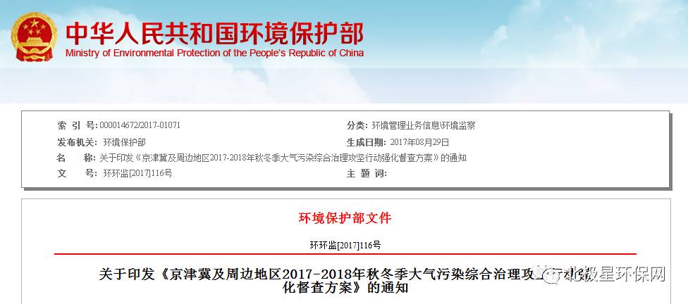 关于印发《京津冀及周边地区2017-2018年秋冬季大气污染综合治理攻坚行动强化督查信息公开方案》的通知